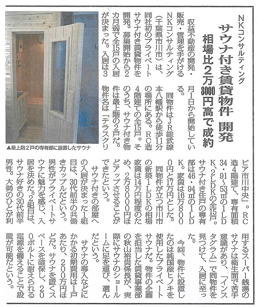 全国賃貸住宅新聞に「サウナ付き物件 相場比2万8千円高で成約」とロウリュ檜サウナ (https://www.kateiyou.jp/sauna/ns_loyly_hinoki.html) が掲載されました。