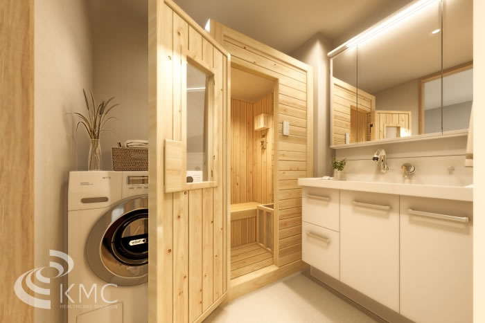 専有部サウナ付き本マンションでは、Cタイプの2部屋限定でプライベートサウナを設置しております。最高温度120℃まで設定可能。もちろんロウリュウもできます。本体は総檜(ヒノキ)造りで、ヒノキ本来の香りを楽しめより一層リラックスしていただけます。ご友人を自宅サウナに招待してみても良いかもしれません。プライベートの時間が充実すること間違いなしです。